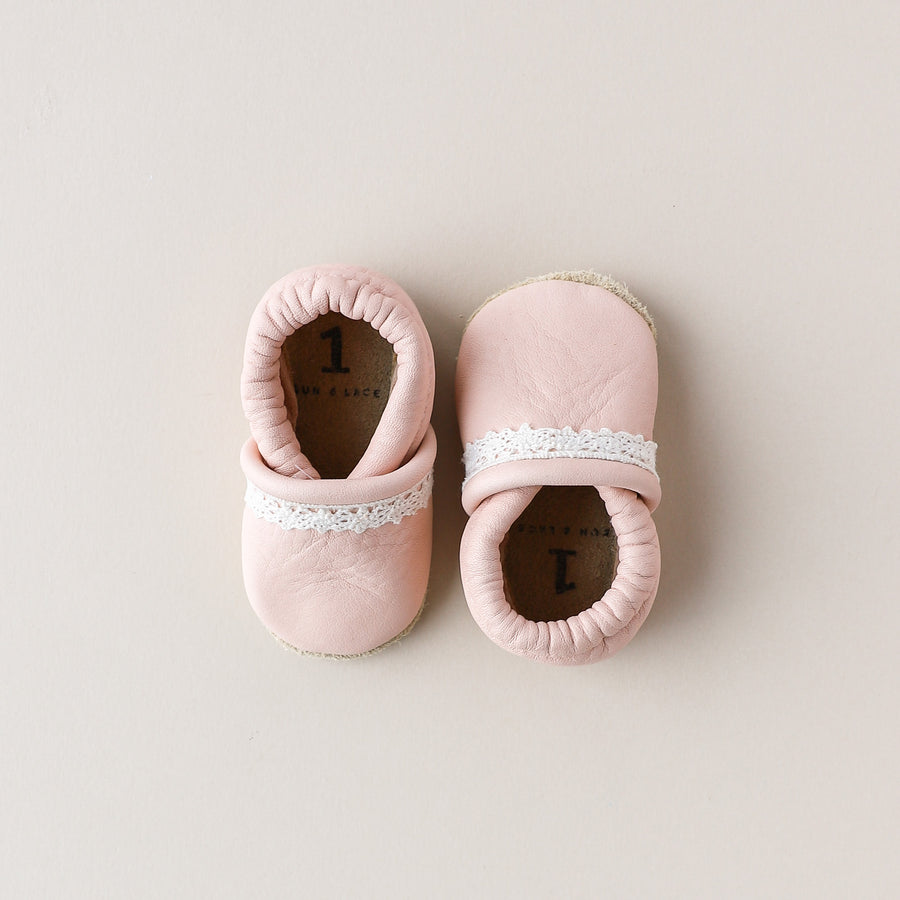 The Lily is our signature slip-on baby shoe style in our beautiful vegetable-tanned Blush leather.