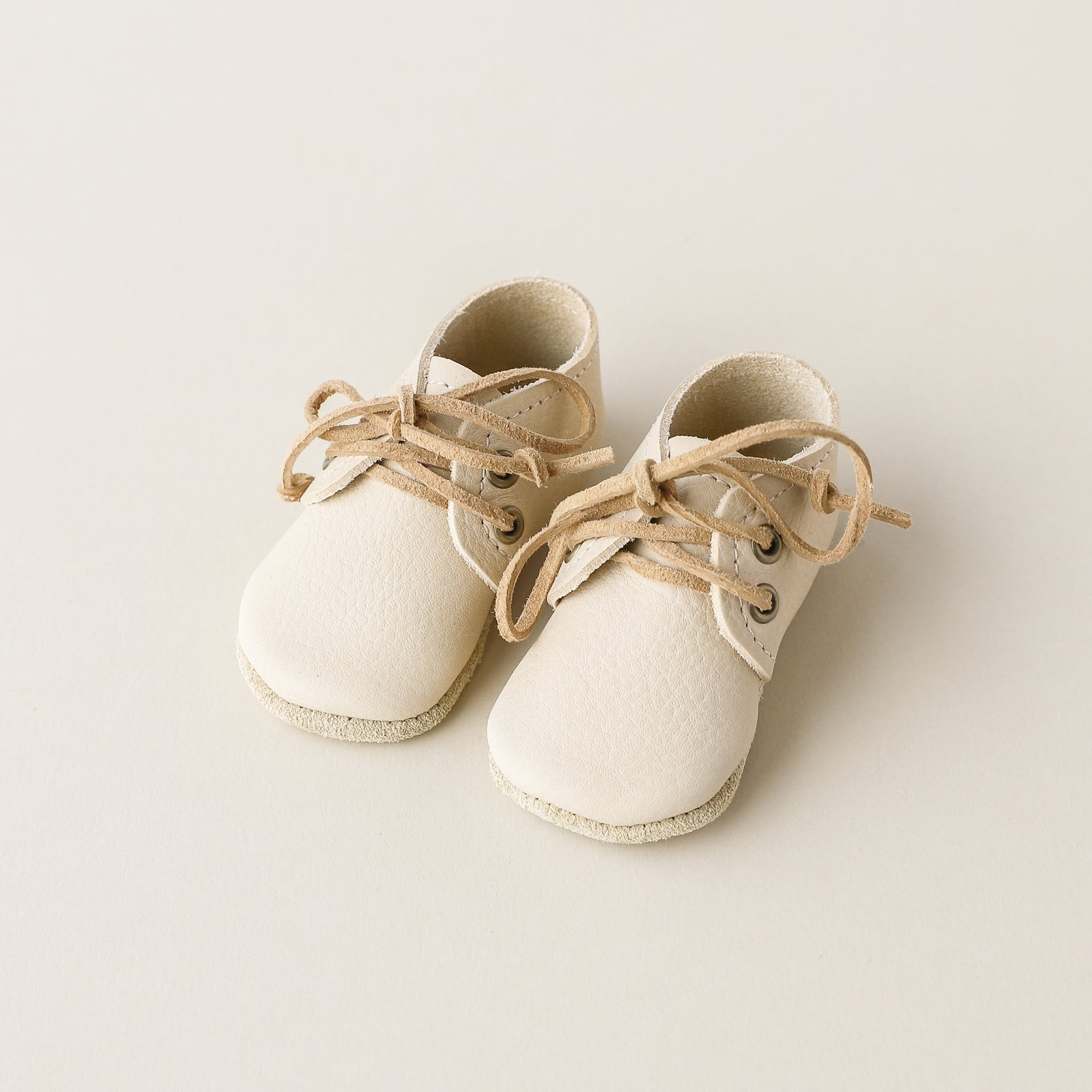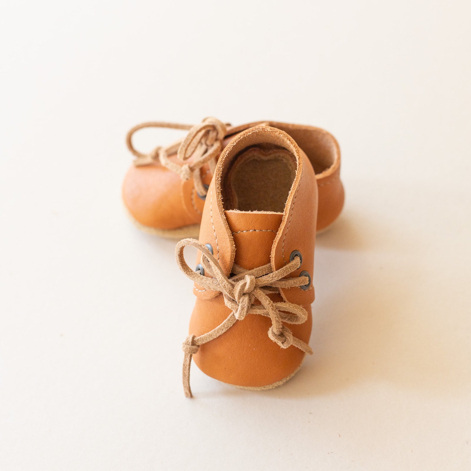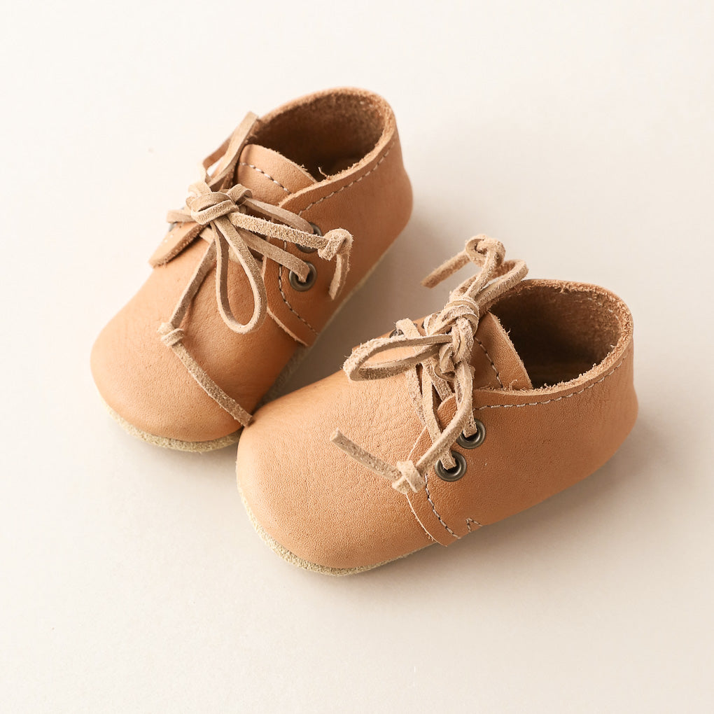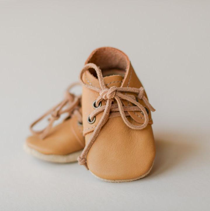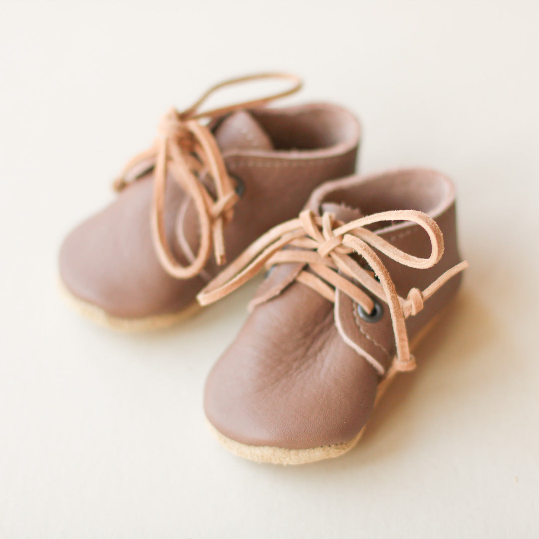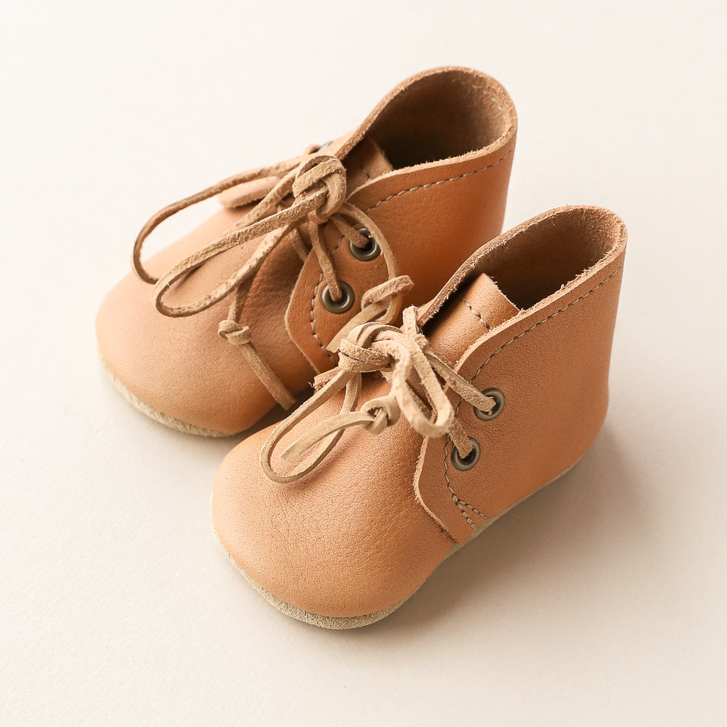 Leather baby boots and oxfords in timeless, neutral colors. The soft soles are made with suede and bend with every move little feet make.Â