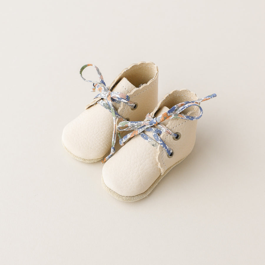The scalloped edge adds a sweet feminine detail. These off-white/cream leather baby boots have soft soles that bend with every move little feet will make.