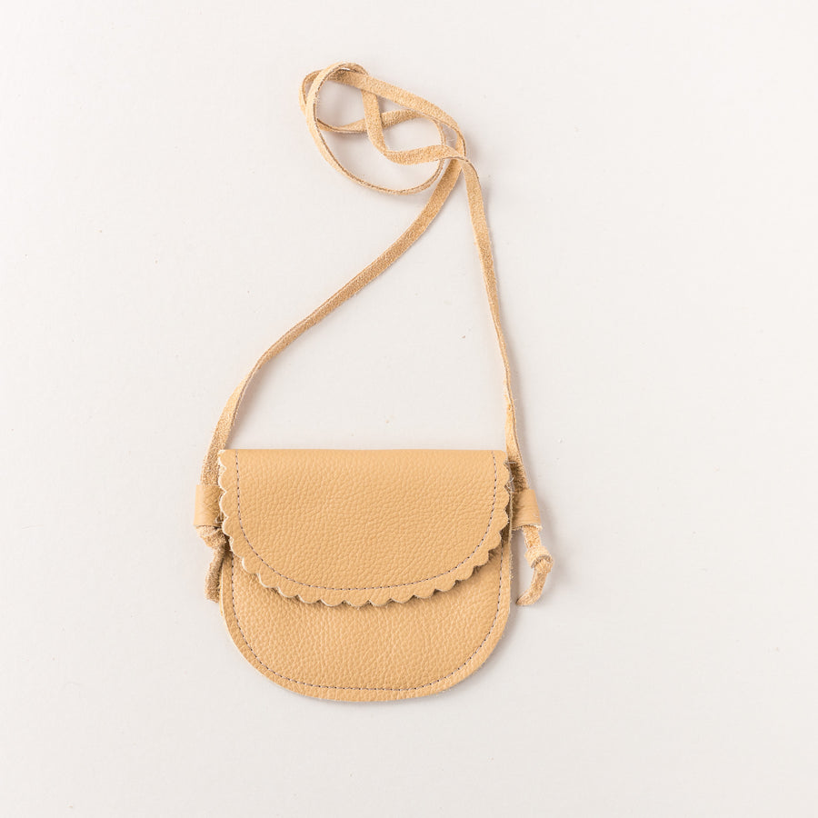 A sweet little bag for little hands! This light brown cross-body toddler leather bag has a scalloped edge flap for the perfect feminine touch. How sweet would this be for a big sister gift? :)