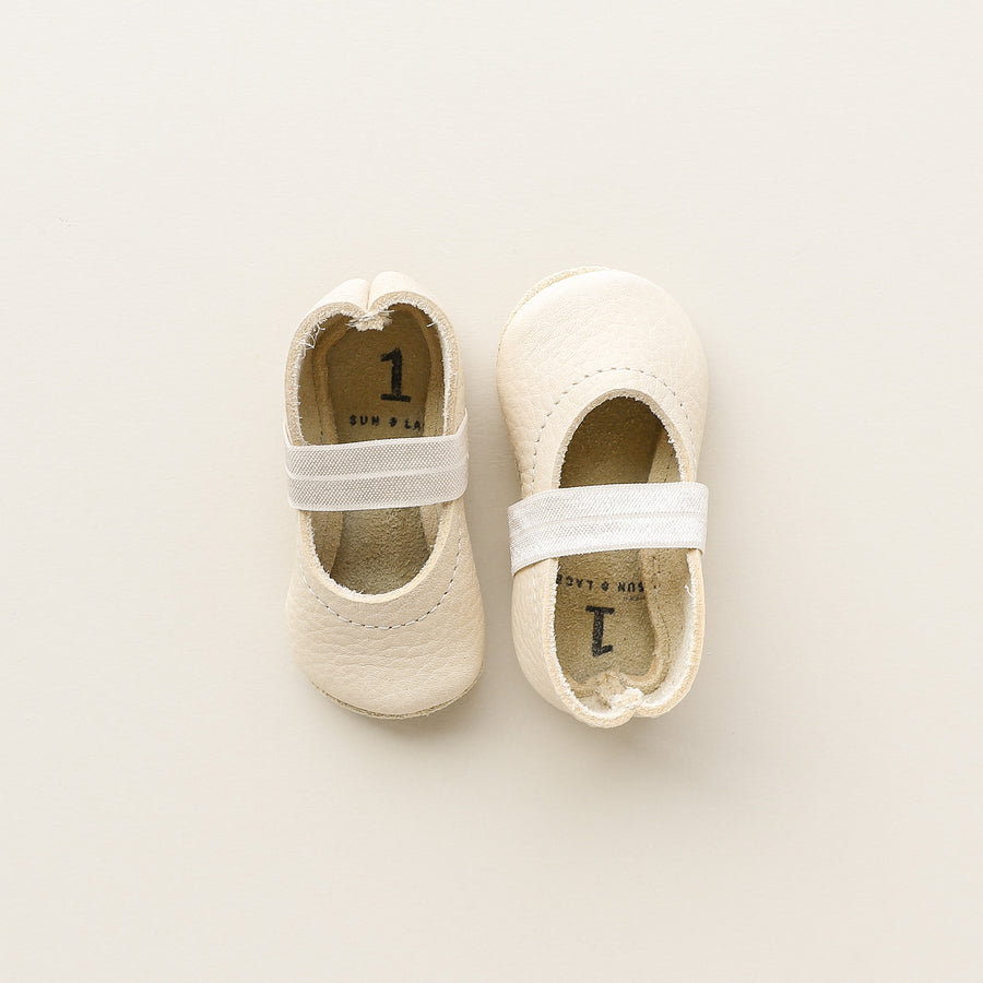 These off-white/cream leather ballet flats have a champagne colored soft elastic band to help them stay on comfortably. Suede soles allow them to bend with every move your babe makes. The classic Mary Jane styles is adorable paired with little dresses, jumpers, or cuffed jeans!