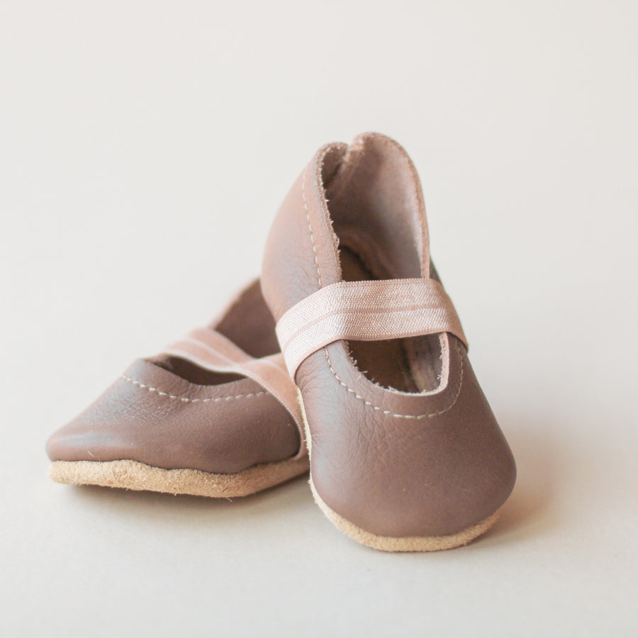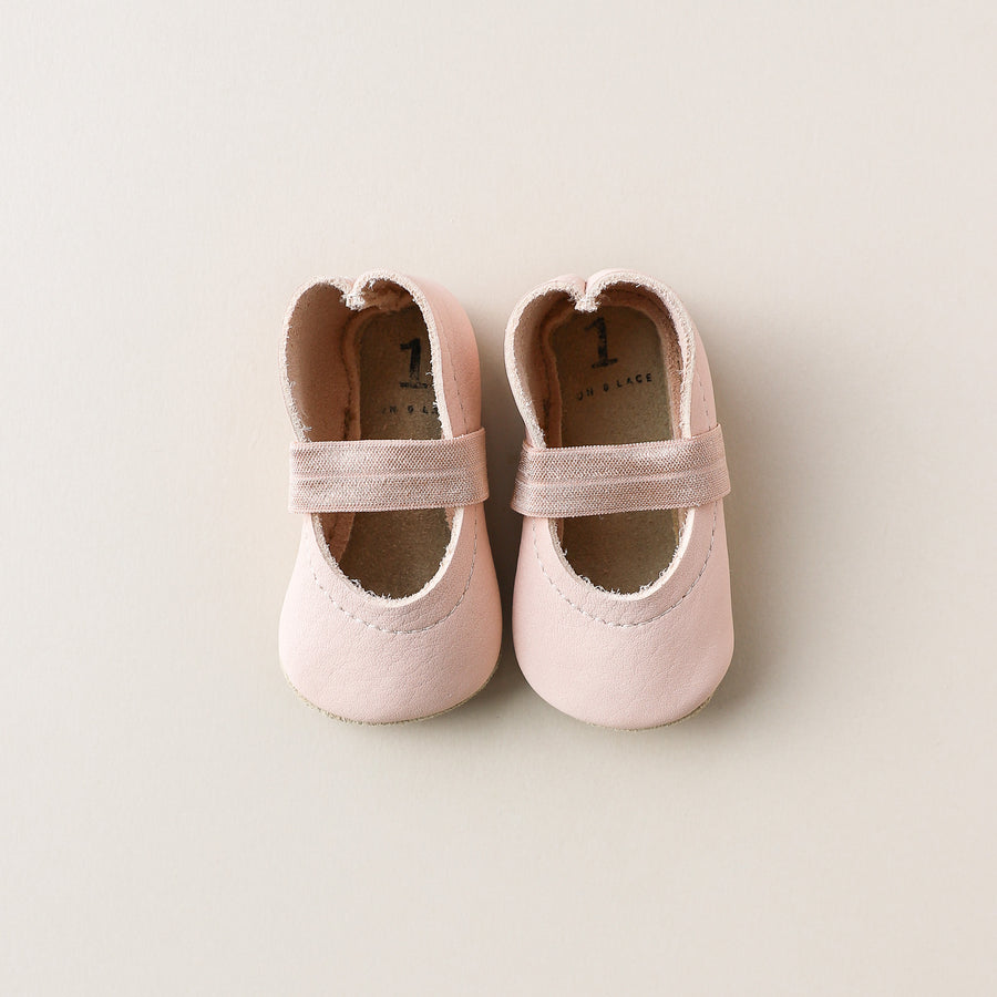 These light pink leather ballet flats have a blush soft elastic band to help them stay on comfortably. The leather will patina with wear, showing natural signs of use. Suede soles allow them to bend with every move your babe makes.